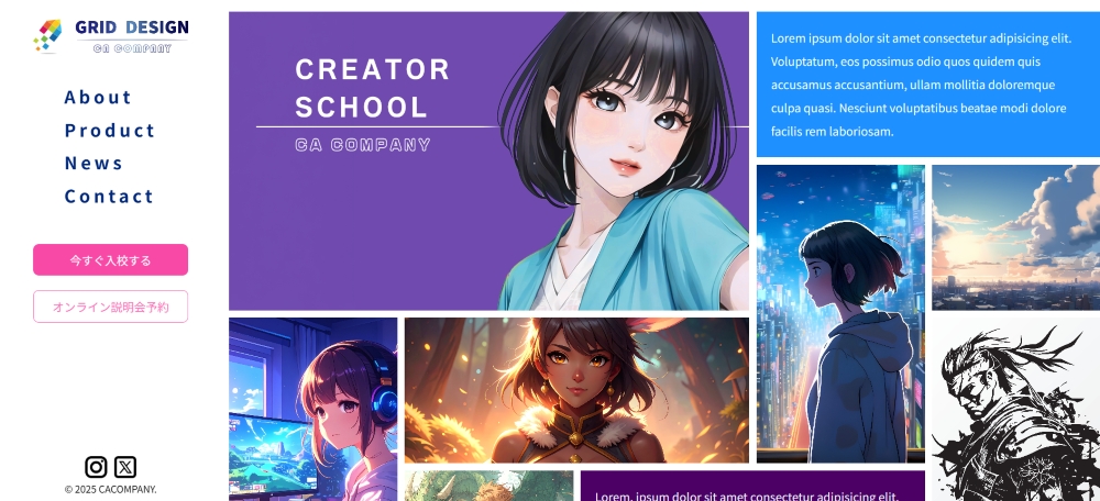 - 製作期間はデザインカンプ込みで6時間で完成。トップページはグリッドレイアウトでモダンなレイアウトに配置.レスポンシブ対応。